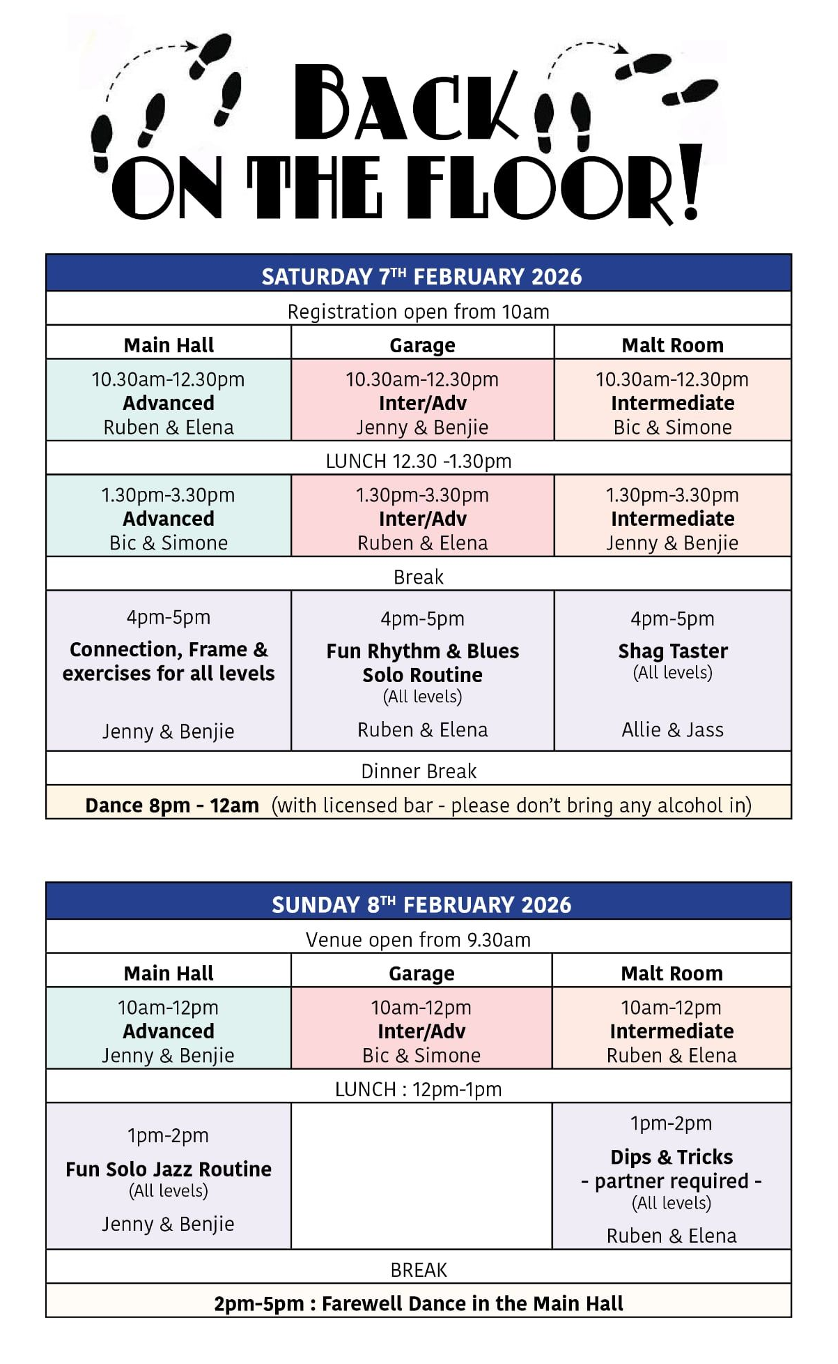 • Classes all day Saturday• Saturday night dance• Classes Sunday • Farewell Dance Sunday afternoon